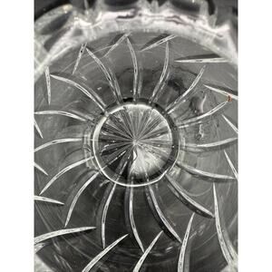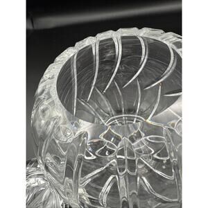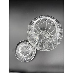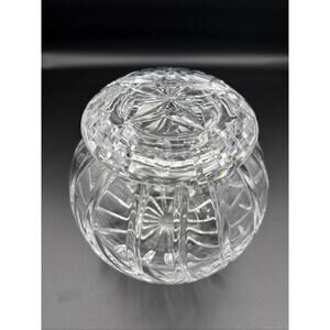 This product is a vintage Rose Bowl cut crystal glass vase with swirl cuts, measuring approximately 6 inches in height and width. The vase features a beautiful clear color and is made of high-quality crystal glass. The mid-century modern style vase is adorned with a lid and is perfect for displaying flowers or as a standalone decorative piece in any room. The intricate swirl cuts add a touch of elegance to this original Rose Bowl vase.
