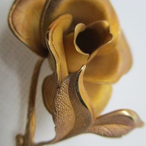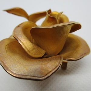 Un Worn Vintage textured matte finish gold tone metal 3 dimensional rose brooch. Length 2 & 5/8 inches. Width 2 inches. Depth 1 inch.