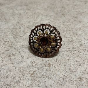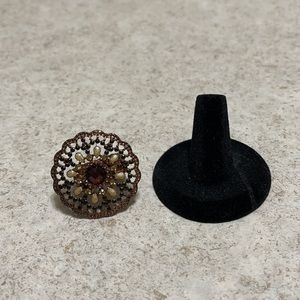 Pretty round fashion ring with enamel detailing and amber color crystal. Ring stretches and can be worn by a size 6-9. Retails for $18