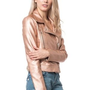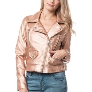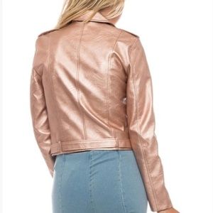 Ride off into the painted sunset in this fabulous faux leather Rose Gold jacket! Turn heads in the color of the moment that we're obsessing over! Featuring a classic rider silhouette with two zip side pockets, belt and front zip with trendy collar. Fully lined. Keep it effortlessly cool in a white tee like our Cross Over Top!