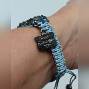 This gorgeous bracelet by Rose Gonzales is made of three layers of braided macreme in multi-colored blue hues made of waxed cotton and silk. The outer layers feature black rhinestones, and the center layer features textured silver discs. This bracelet is adjustable, fits most, and is easy to put on and take off by pulling the strings in opposite directions.