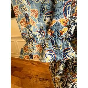 ROSE & OLIVE YELLOW AND BLUE ART DECO FLORAL SHORT RUFFLED HEM SLEEVE V NECK WOMENS PLUS SIZE 2X