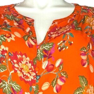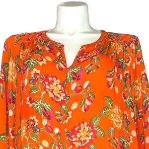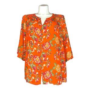 ROSE + OLIVE Blouse 1X Orange Floral Top Plus Size Boho Smocked Neck 3/4 Sleeve