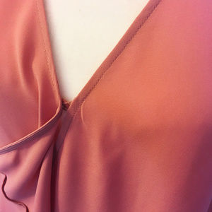 True tie-wrap blouse in dusky rose. Long sleeves with fabric-covered buttons at wrists. Two sets of ties and a hidden button to ensure wrap does not migrate during wear. Purchased in March 2018. Comes with extra fabric-covered buttons. Wear to the office as part of a suit, dressed-up with crisp ankle trousers, or dressed-down with leggings and tall boots.