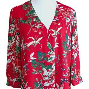 ROSE & OLIVE Romantic Floral Red Top Blouse Medium V-Neck 3/4 Sleeves Career