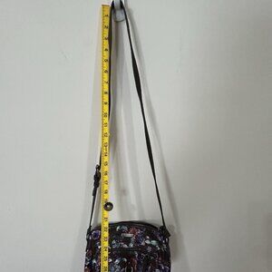 This ROSETTI vinyl crossbody purse is compact, stylish, and functional. It features a brown background with a bold floral print in purple, pink, turquoise, and white. The strap is adjustable with a buckle and can be lengthened or shortened beyond 22" as needed. A decorative buckle adds extra charm to the front. Multiple pockets offer great organization.