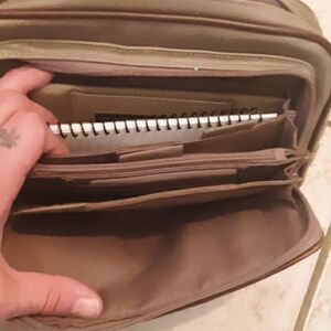 GOOD PREOWNED CONDITION! Made of Vinyl (fake leather).Has two main compartments, and an organizer section, including notepad, detachable mini mirror, 6 slots for cards,pen slot (comes with pen with no ink left) labeled cash/coin,checkbook flags, and keyring. Has detachable crossbody strap,, and goldtone hardware. Does have a few small scratches and flaws as shown, but not at all noticeable. There is a small ink stain as shown in corner, shown in last picture.
