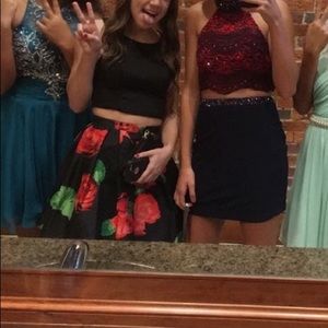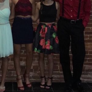 Rose themed, red & black 2-piece homecoming dress with a cutout back 😍 super cute, comfortable, only worn once and in PERFECT condition. Tags say size 1 but fits an XS/S. Wore w/o a bra the night of because of the cut out back and never had to worry about anything. Accepting offers, if you need more pictures of me wearing it just comment! ❤️