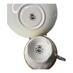• Saucer: The outer edge is scalloped and rimmed in gold.