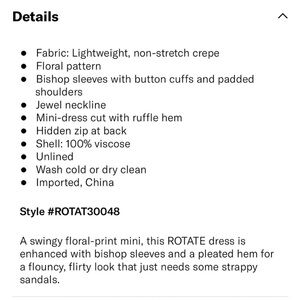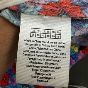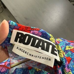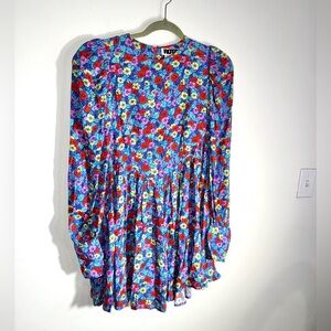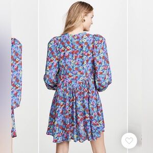 This Rotate Birger Christensen Alison Dress in Poppy has a loose fit with loose sleeves that close at the cuff. The shoulder pads add character to the otherwise short silhouette. It is a colorful dress with all-over floral print.