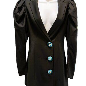 This blazer-style mini dress is punctuated with exaggerated puffy sleeves leading to fitted cuffs for a true 80's style and is complete with crystal-embellished flower-shaped button fastenings to the centre for a glamorous touch.