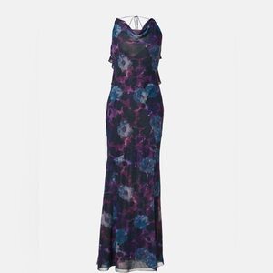 Purple Floral maxi slip dress crafted of delicate chiffon is complete with cascading ruffle tendril, cowl neck and high side slit. Please note there is a flaw see more details below - romantic vacation vibes from this gorgeous gown.