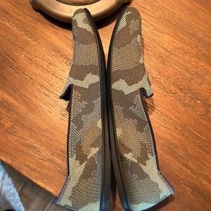 Rothy’s rounded toe green camo flats with neon orange and dark gray heel stripe