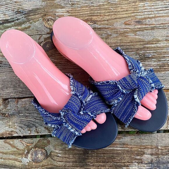 ROTHY'S The Knot Indigo Blue Denim Frayed Slip on Sandals Wm’s Sz 9.5