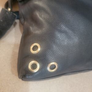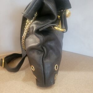 Rough Roses black leather crossbody handbag. The bag has a single compartment with 2 slide pockets and a zippered pocket. There is a chain to carry in your hand. Please see all pictures.