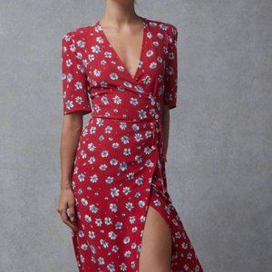 ROUJE GABIN RED FLORAL MIDI WRAP DRESS