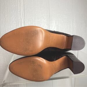 Rich chocolate brown leather croc embossed boots with a tube shape. Perfect pair of 70s inspired heeled boots! Ankle strap and metallic buckle. Golden R on the back of the heel.