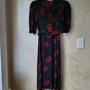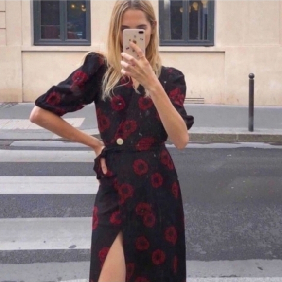 Timeless and vintage like, you can wear it with flat shoes or high heels. Midi wrap dress. Puff sleeves and vneckline. 1 button fastening and belt. 100% viscose. Rouje size 36.