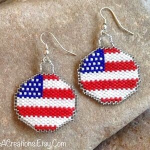 Here’s a pair of Round American Flag Beaded Earrings that are lightweight and comfortable to wear all day long. Made with high quality glass Delica Beads, beaded one bead at a time. Love and passion goes into making my jewelry. This process requires focus, patience and dedication. Each bead is 16th of an inch and can take hours to complete a project.