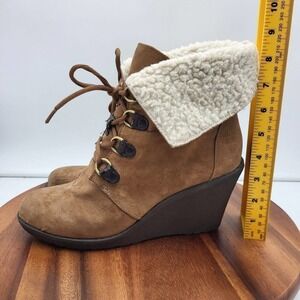 ROUTE 66 WEDGE BROWN LAMBSWOOL TRIM WEAR UP OR DOWN AROUND ANKLE LACE UP WOMENS SIZE 6. Wedge heel, Lace-up design, Versatile style, wear cuff up or down, #route66, #boots #ankleboots #wedgeboots #lambswoolboots #winterboots #fallboots, #funkyboots #highwedgeboots #ootd #ootn #fashionboots #motorcycle #academia #cabincore