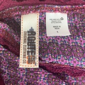 Features: lace trim, scoop neck, mini floral design throughout, purple, green, orange, pleating down front, recommend wearing a cami underneath, very flowy, not fitted, very lightweight, lace across to of each shoulder, shirt