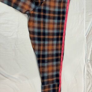 Crafted from 100% cotton with a brushed flannel feel, featuring a rich navy, orange, and gray plaid pattern.