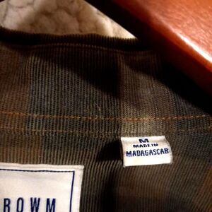 ROWM Men's Shirt. Made from 100% cotton corduroy in a brown plaid pattern, this long sleeve button-down shirt features a collared neckline, button closure, and lined interior. The shirt is easy to care for with machine washable instructions, making it a convenient and practical choice for any man.