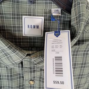 ROWM green plaid shirt. Long sleeve and button/snap down. Size 2XB with snap closure. New With Tags. 100% cotton. Measures 28" across pits and 30" long from top of shoulder to hem. Comes from a smoke free home with awesome pugs!