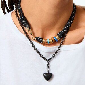 Cord necklace with gold tone, pave and enamel ring slider charms