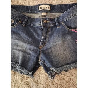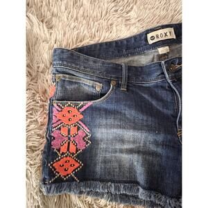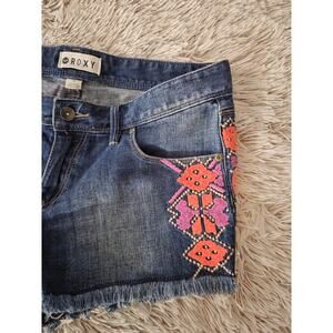 ROXY Blue DENIM Boho Aztec Pink Purple Embroidered Cutoff Jean Shorts Womens 30