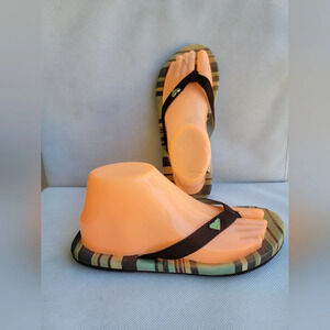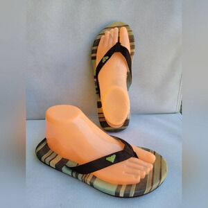 Roxy fabric flip flops/sandals (sz 7). The sandals have 5/8" brown cloth straps. The insoles are striped fabric. There is a little discoloration near the toe area. Other than this, they are in good condition. Please see all pictures.