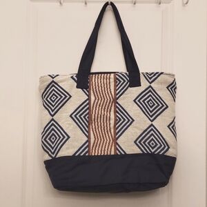 EUC! Good sized tote bag, quality, Breathable cotton material! Knit and canvas designed! Lined. Outer pocket with fringe detailing and snap closure and one inside pocket! Full zip closure to top of bag! See approx. measurements in Pics. Bag is navy, slightly lighter blue, orange, and cream/off white! Very minimal wear throughout with no damage! Zipper, snap closure, and handles in perfect condition! No noticeable staining or strong smells :)! see pics for condition details!