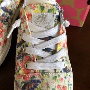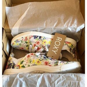 ROXY makes these adorable "Libbie" Slip-On Canvas Sneakers in ladies size 6.5. These are in a cute floral pattern with white background. They have a cushy memory foam footbed and a soft beach towel lining. Rubber soles. Crisscrossed elastic gores on each side and heel pull for easy on and off. These are adorable with a flexible, feminine fit and feel. NWTIB!