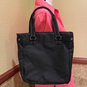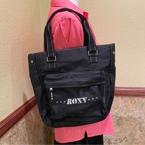 ROXY Nylon Handbag, Black, Military Stars, Glitter Logo, Adjustable Side Snaps, Purse. Preowned. Nice condition. Unsnapped, the width measures approx 14”. Height measures approx 13”. Depth measures approx 3”. Handle drop measures approx 6”. The logo and stars on this bag have a military look.