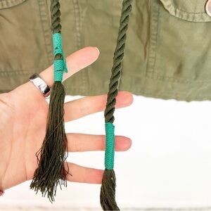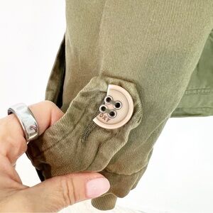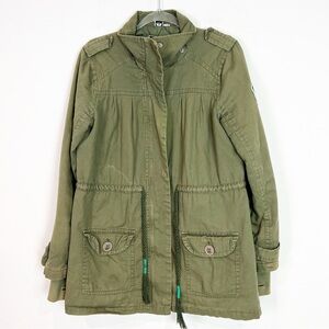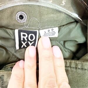 Roxy olive green drawstring waist utility jacket. I believe this jacket had a snap on hood that is not