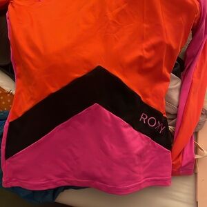 Long sleeve rashguard. Colors are pink, orange and black. Slim fitting so really a OS fits all