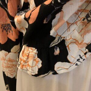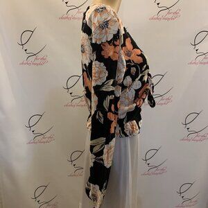 ROXY Size SMALL. Ruffled Tie Front Long Sleeve NWT Top. Ruffled at Hem. Cotton/viscose. India. Center back 18.4" including ruffle. Bust 16.5/33" but adjustable with tie. Sleeve 25". Excellent pre-loved condition. New with tag. No spots, tears or damage.
