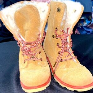 ROXY WO SIZE 8.5 FAUX LEATHER TAN BOOTS FAUX FUR LINED LACE UP BOOTS CLEAN EUC BERY GOOD CLEAN CONDITION