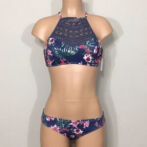 Sheer crochet accents the high neckline of this Roxy bikini top, a vibrant look. Criss cross straps that adjust in back. Easy to adjust for sizing. Soft removable pads. Bottoms have crochet trim in back. Really pretty! Beautiful tropical blue, pink, and green print. Fully lined. Has a partial tag.