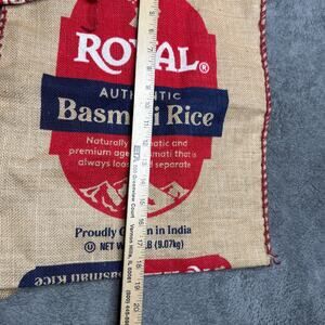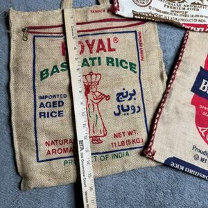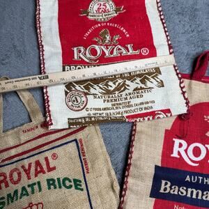 The product is a lot of 3 empty Royal Basmati rice bags made of burlap and jute, featuring a woven pattern and zip closure. These rectangular sacks are in a multicolor palette and are one size, perfect for all occasions. Hand wash only and made in India, these original grain sacks from the Royal brand are a unique upcycled tote solution for storage or decorative purposes. Perfect for adults looking for a stylish and functional addition to their collection.