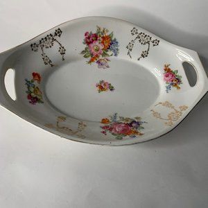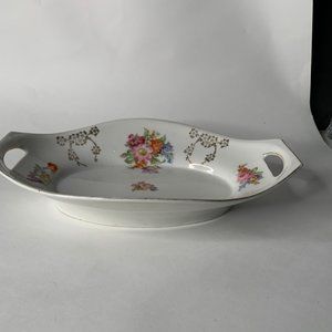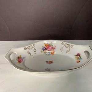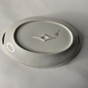 This plate is in excellent condition, no chips, cracks or other condition issues. I'm not an expert but I think could be hand painted. t has a very interesting oval shape with a handle on both sides.