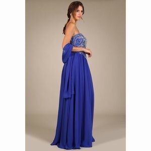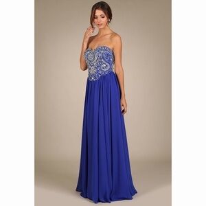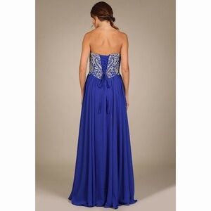 Strapless sweetheart adorned silver rhinestones. Flowy with corset back. Dress runs small please check size chart