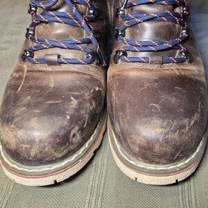 Worn but in great condition. Scuffed due to being put to use. They are a rugged boot and stand up to heavy wear but I might not recommend for hiking in icy hilly terrain.