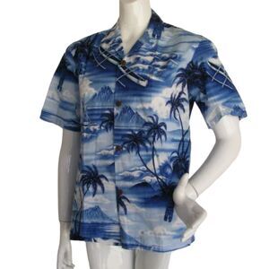 ROYAL CREATIONS Hawaiian Shirt, S, Blue/White, Sea View, outriggers, Tikis