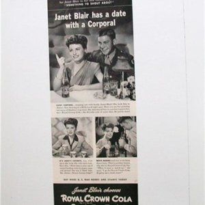 Early and hard to find advertisement for Royal Crown Cola featuring actress Janet Blair. This great WWII era Print Ad was removed from a vintage 1943 Magazine.