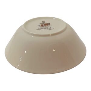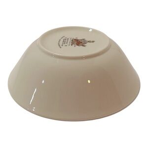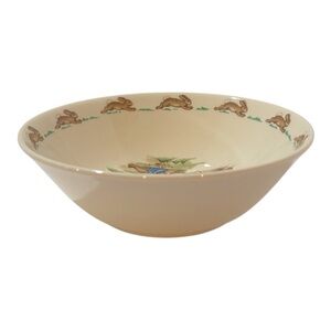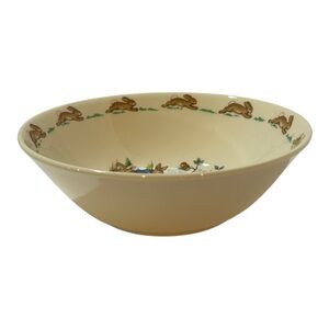 Cream bowl with playful animal illustrations. Features rabbits and an orange tree design.