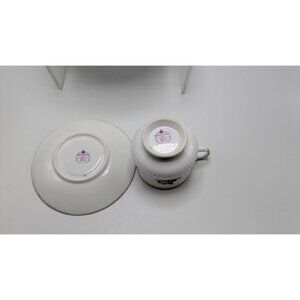 A classic teacup and saucer set featuring vibrant yellow and pink roses with a charming cottage design. Crafted with fine bone china and gold trim.