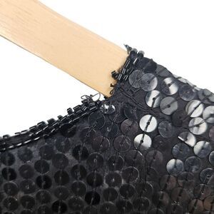 Royal Feelings vintage pure silk sequin blouse. Size large. Lined. Scalloped hem. Amazing pre-owned condition. There is a slight seam separation at upper back neckline (see photo 8). Also one of the sequins has lost some of its black color (photo 6). Chest approximately 21 inches pit to pit. Length approximately 26 inches.