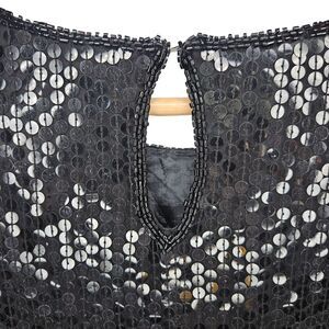 Royal Feelings vintage pure silk sequin blouse. Size large. Lined. Scalloped hem. Amazing pre-owned condition. There is a slight seam separation at upper back neckline (see photo 8). Also one of the sequins has lost some of its black color (photo 6). Chest approximately 21 inches pit to pit. Length approximately 26 inches.