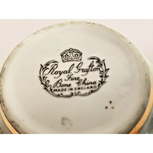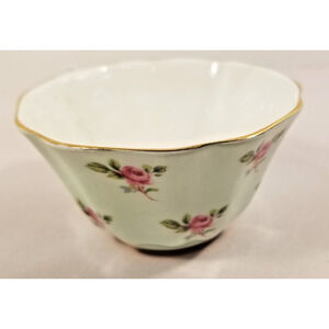 This round, small open sugar bowl by Royal Grafton Fine Bone China England features a vintage 1960s design with pink roses. Made in England, this glossy finish sugar bowl is dishwasher safe and perfect for all occasions. It is an original piece from the Royal Grafton franchise, making it a unique and collectible item for lovers of fine bone china and pink roses. With a mint green and pink rose pattern, this sugar bowl is a charming addition to any kitchen or dining collection.